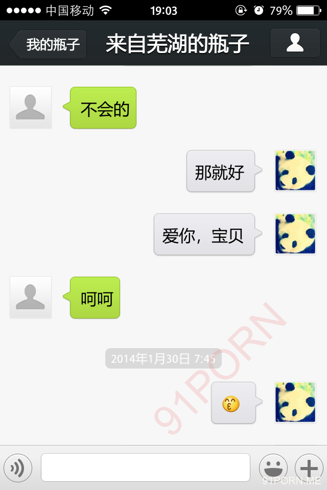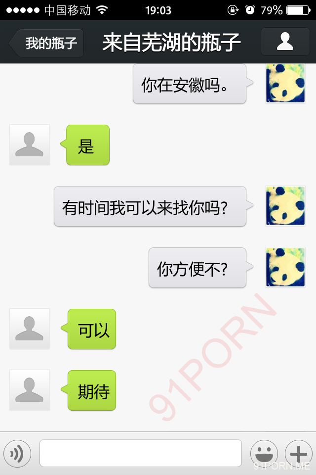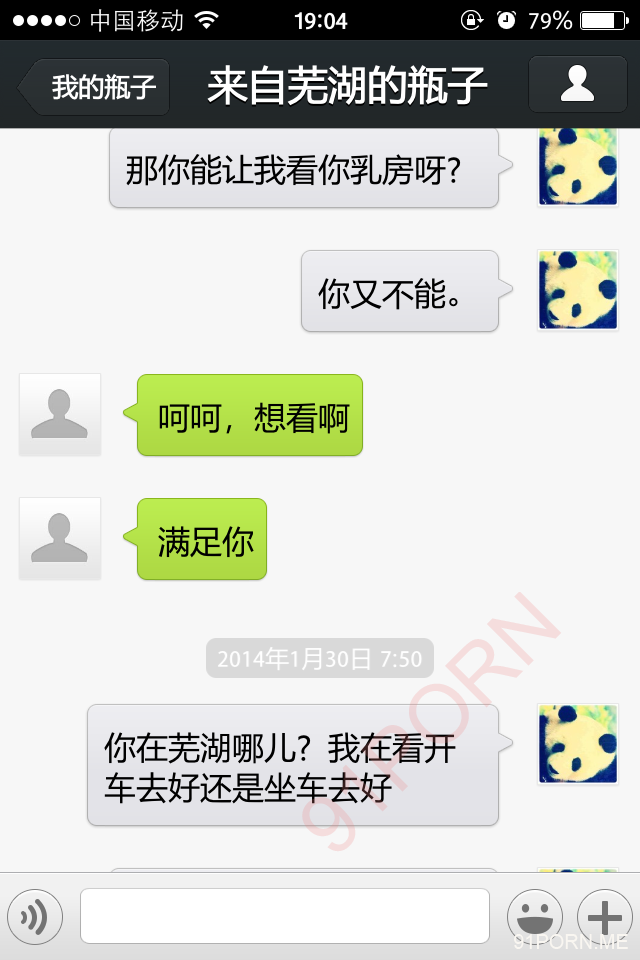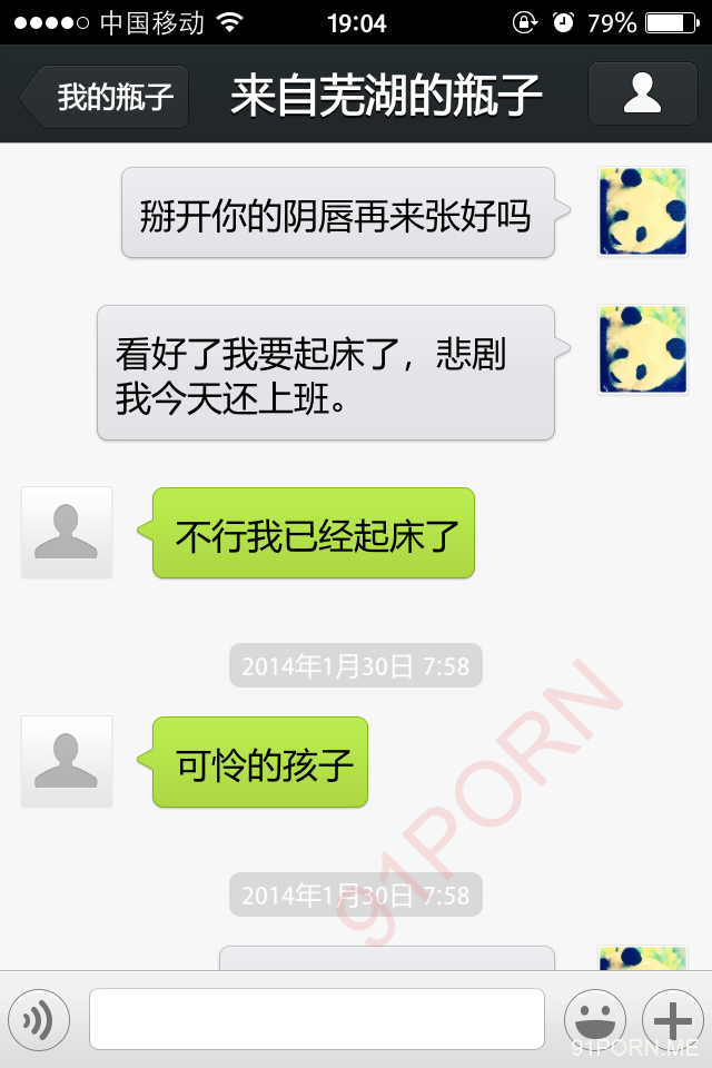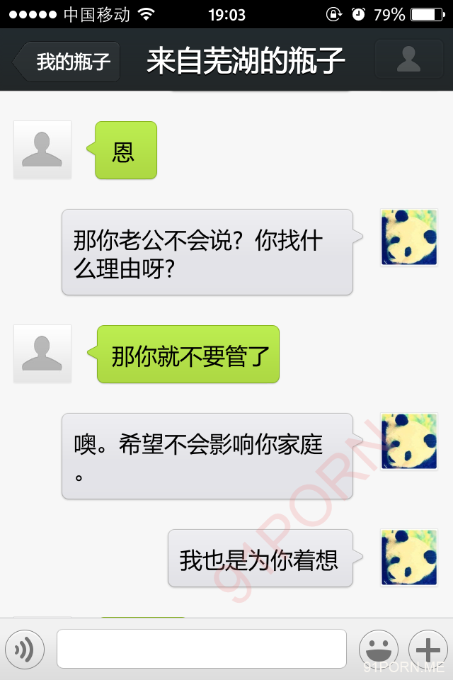前几天早上很早醒了,无聊,捞了几个瓶子,和一个26岁的良家聊天,小孩已经4、5岁了吧,后面经不住楼主的语言、文字挑逗,被我弄的招架不住了,很期待的让楼主过去艹她,说实在的,有点远,心有余而力不足。下面是对话,可能有点乱,将就着看吧!露脸的我都打马赛克了,隐私还是要保护的。