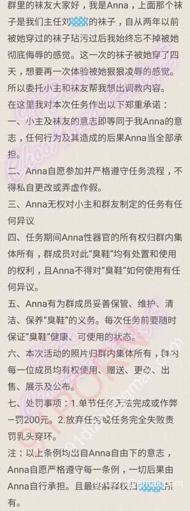 我一路小跑回到家,关上门就在群里和大家报了到。没等我休息小主就要我立即脱光衣服,给我发来了一份任务宣言,要我在群里读出来,我一下就怔住了,之前没有过啊,再一想这不就是头几天那几篇袜奴H文里的情节么....这是想把我带入剧情的意思呀。于是按照小主的意愿把下面这样羞耻的文字全部朗读给大家听。可是过程很不顺利,大家对朗读有诸多要求还故意不告诉我——不能有停顿要流畅,每一个吐字发音都要清晰不可以含糊不清,不能有羞涩感、要掷地有声....啊~让我读了一遍又一遍...急的全身赤裸的我直握拳跺脚....直到大家满意了才算通过。