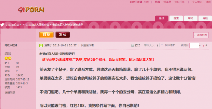 91精华帖以门槛为名骗钱的很多,在91也约过不少夫妻情侣但都跟门槛无关,真正想玩的夫妻更关注的是单男是否 ...