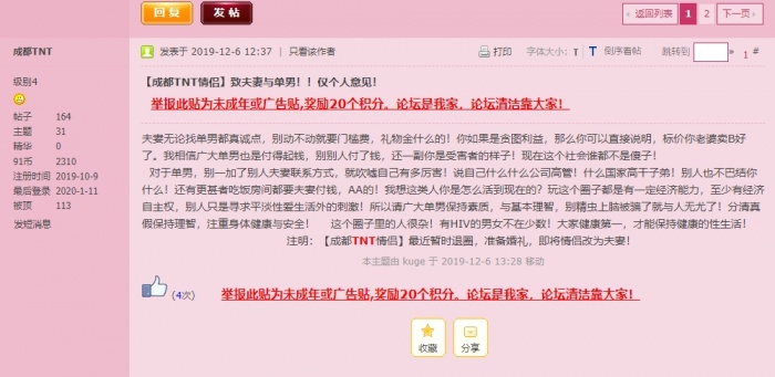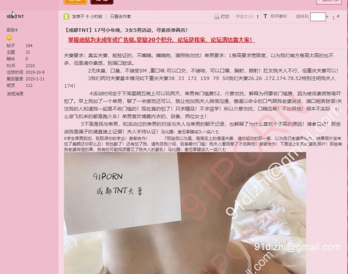 11月26号,发帖标题“【成都TNT】露脸口活小娇妻,单约活动进行时~~~~~~~” 配文“麻烦别装夫妻来忽悠我!” 我就呵呵了~图片来源是百度云泄露的一大堆私人照片中的一堆情侣,最早于19年9月底在1024上发布