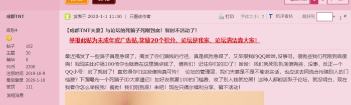 1.如图所示,虽然显示发表过31个主题,但是我通过搜索TNT这个关键词只能找到17个帖子,另外14个可能没有包含他自己名字,或者删除了,anyways,随便拿两个帖子里的内容就足够石锤了。 此人一个多月来多次盗图来发帖抨击收门槛的夫妻,引起了一些单男和不收门槛的夫妻们的共鸣(包括我),然而在1月9号神转折,开始继续拿假图(后面我就不再重复了,他的图没有一张原创,都是盗来的)招单男收取门槛52元,并且与粉转黑的单男们开始互喷,不得不说这位抠脚大汉骂起人来还有有两手的,特别是下图这句,非常有马路边叉腰指手,唾沫四溅的骂街的画面感。