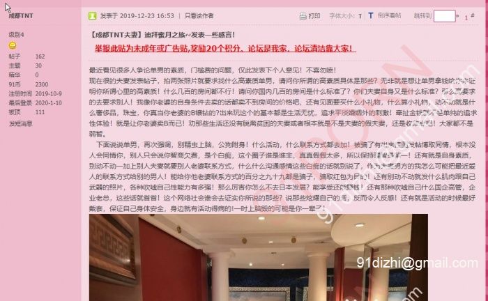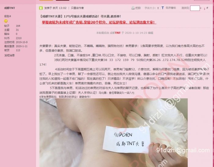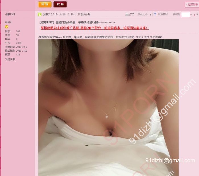 11月26号,发帖标题“【成都TNT】露脸口活小娇妻,单约活动进行时~~~~~~~” 配文“麻烦别装夫妻来忽悠我!” 我就呵呵了~图片来源是百度云泄露的一大堆私人照片中的一堆情侣,最早于19年9月底在1024上发布