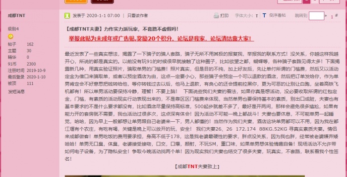1月8号,发帖标题“【成都TNT夫妻】028地区寻真实夫妻,情侣!高素质单!” 虽然依旧没配文,但是开始行动起来要“活动”了!,当然照片还是盗来的,依旧是推特大神@loganone3 的图,所以就不再po了(编辑到这里已经有点累了),想看的各位自己去她推特看原图吧