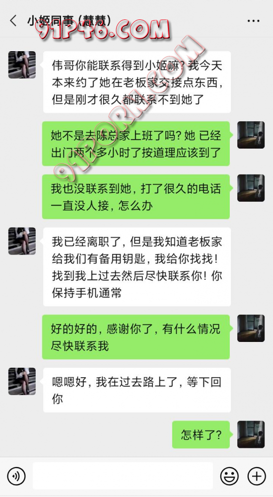 时间转眼间过了将近半年,小姬回到家几乎是没有提及过工作上的事情,最多只是说说,有女同事一起在陈总家做家务,一起接待很多的客人。她经常早出晚归,有时候甚至几天没回来。但是具体还有工作内容是什么小姬都没有透露。后来有一天,小姬的一个同事小慧联系了阿伟。
