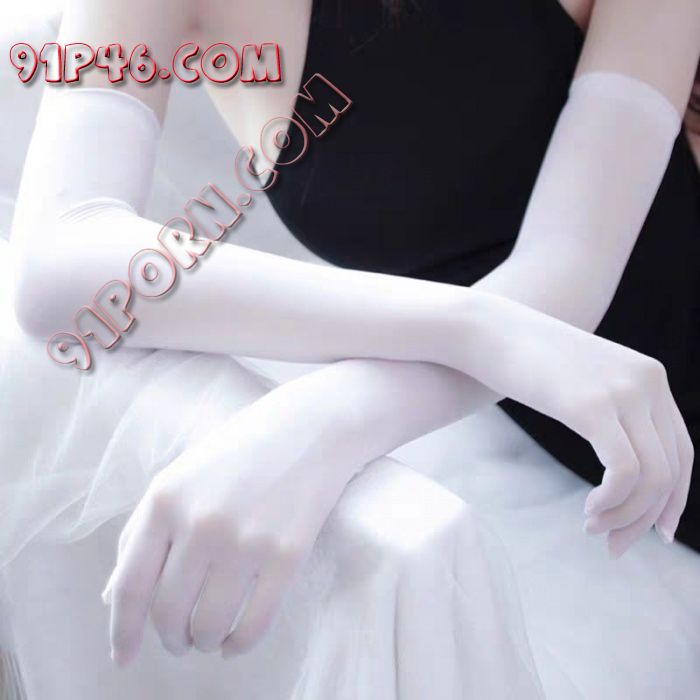 双腿裹着一双白色长筒丝袜+白色吊袜带,一条白色内裤(别开裆,后面有目的),足踏白色10CM高跟婚鞋,双臂套着一副新娘手套。