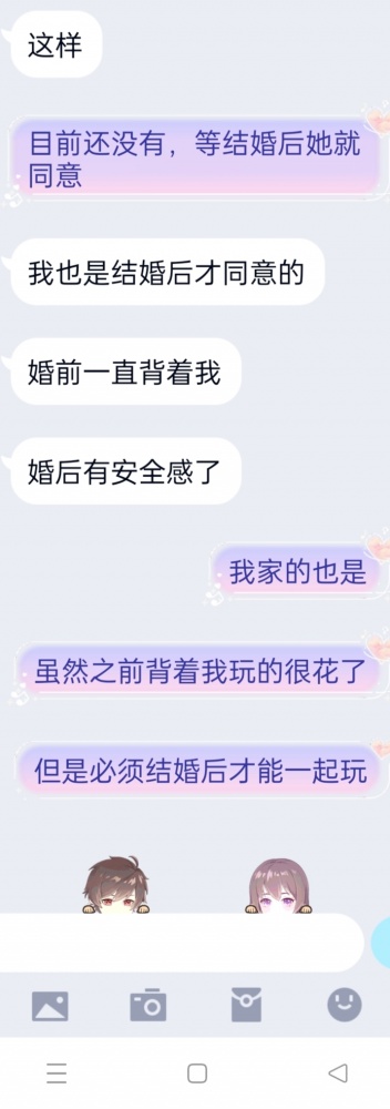 并且会给自己一致的答复,就是结婚后陪你玩,你想让我当免费精盆,或者交换。必须结婚后。