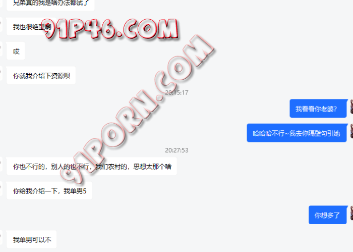 B搞死都不说到什么程度了,就只说一年都在说,妻子不同意,又说是农村的,最后竟然说老婆做爱的时他拍照都不同意【这都不同意,还想着3P,4P????我不李姐】。【最后发现他说的都是骗局,刚开始没有结束对话是因为B老婆微胖极品,想多聊聊,能开发出来那肯定很nice】