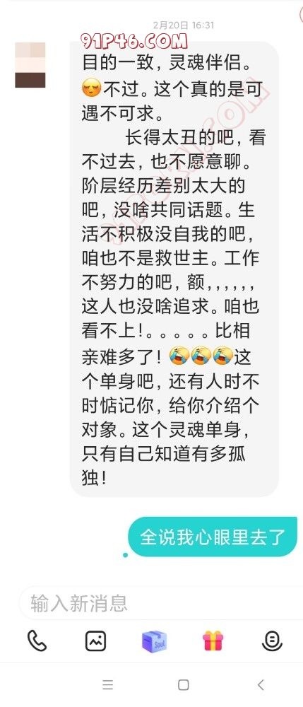之前的老帖不更新了,近期和大家一起讨论如何用soul等聊天软件更快的约到有缘人。发现不论是已婚还是单身在聊天交友中都有着自己这样那样的问题,也看到许多朋友在不放弃中获得了成功的快乐。喜欢的可以找我