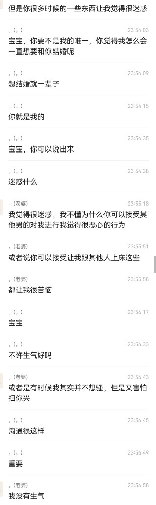 尽力了,但老婆还是没有认同我的想法,老婆不是保守的人,为什么还是不能接受我是绿帽呢?苦恼,(聊天记录顺序可能有点混乱,到可以根据时间来看)