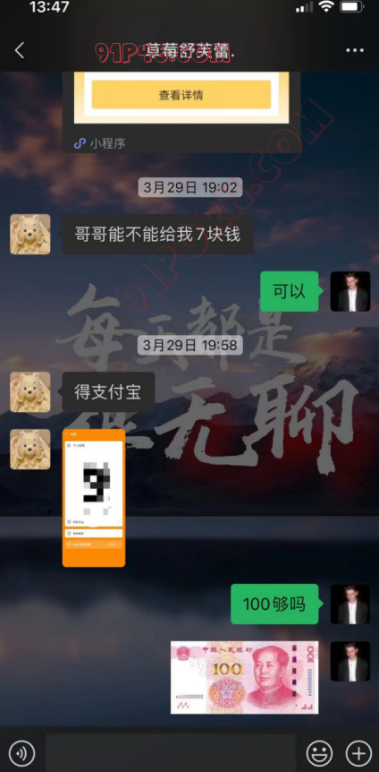 还有一种就是关系更近一点,甚至是已经睡过的,这种情况,你同样不能纵容她找你要钱的习惯。比如下面这个案例,这个女的第一次跟我约完会,我送她回家的时候说没钱买烟了,然后我就给她发了几百红包。我到家以后她又找我说钱用完了没钱吃外卖了,这个时候,我先是表明自己的立场,告诉她不能一个劲找我要钱,说完以后我还是给她点了外卖。对于这种已经跟我发生过关系的,我会稍微纵容一点。但是她一而再再而三跟我找借口要红包,我就不会再纵容她了。