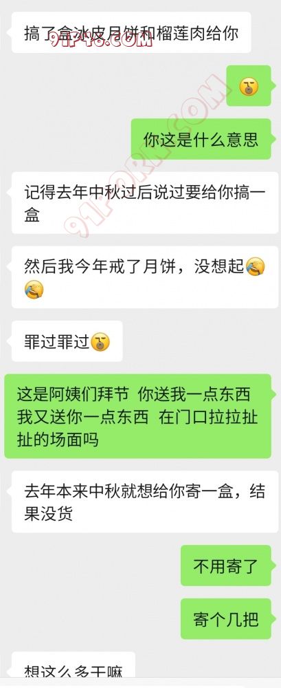 9月6日,马上中秋节我惯例寄了一些她喜欢的海味干货给他们,没想到他们居然搞了一盒冰皮月饼和榴莲果肉给我,他说是他老婆的主意,我对他说不要寄了,寄个几把。 其实我内心还有一句潜台词没有说出来,“寄个鸡巴 不如叫你老婆给我来一发更实际啊”