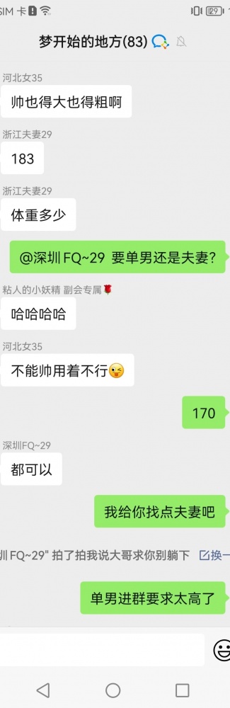 有没有想进夫妻群的夫妻或者单男,单男要求长的丑素质有一定经济能力,最好是活动过,群里氛围很舒服,朋友之间交流,虽然人不多但是活跃度很高,每天消息基本不低于1000+单男进群有门槛,欢迎夫妻同好一起交流,来了就是朋友 .