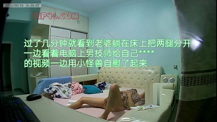 大概过了半个小时左右看见老婆把以前我买的小怪兽给拿了出来,以前跟老婆做爱前我把小怪兽拿出来调情她总是不愿意的,后来就没用过,也不知道放到哪里去了,没想到是被老婆给藏起来了。过了几分钟就看见老婆拿着小怪兽去卫生间洗了一下,从卫生间出来后她就把内裤给脱了躺在床上一边看视频一边用小怪兽自慰了起来,真的很难想到平时那么保守的老婆在性欲药的作用下会那么的淫荡,反差真的是特别大,在摄像头里看到短短的一个小时左右老婆竟然用小怪兽自慰高潮了两次。意外的是在第二次自慰高潮的时候竟然有听到老婆呻呤了几声,在我面前可是从来都没有呻呤过的。老婆这两次自慰的过程就不叙述了,直接看我分享的视频和图片就知道了。