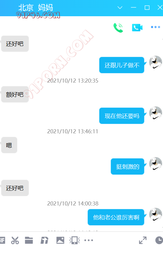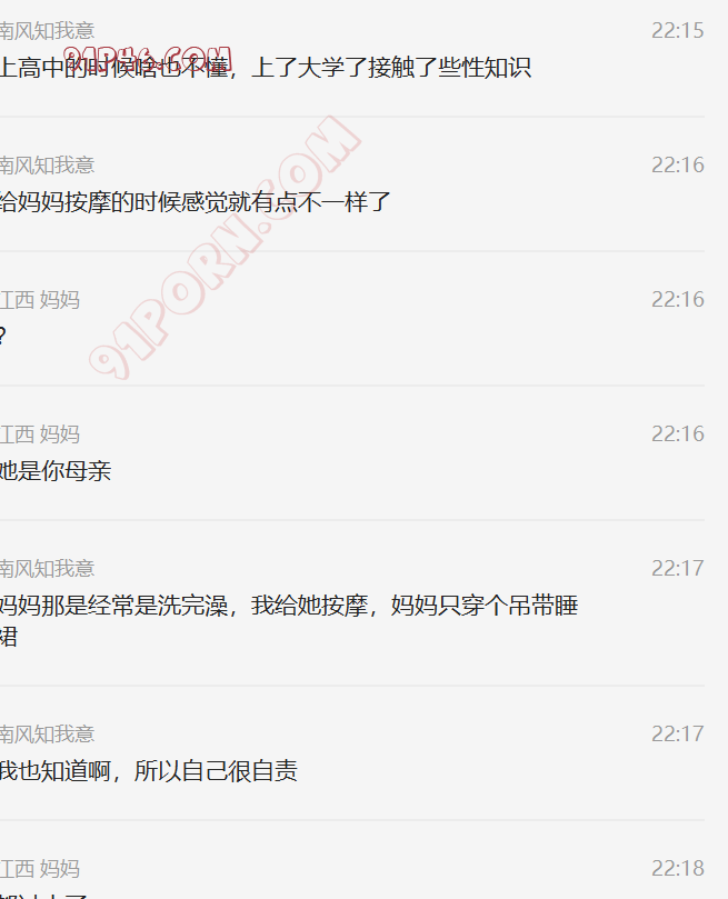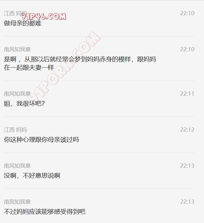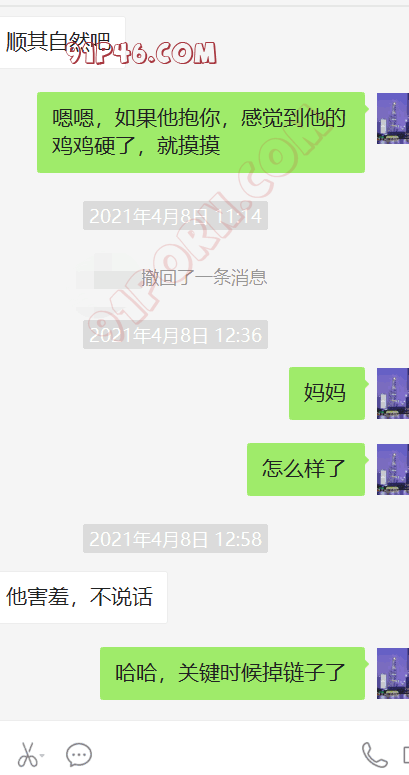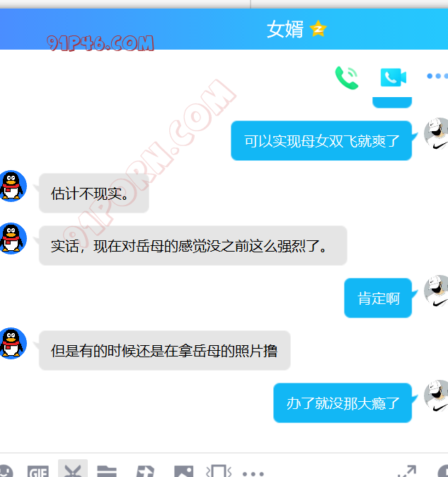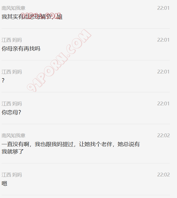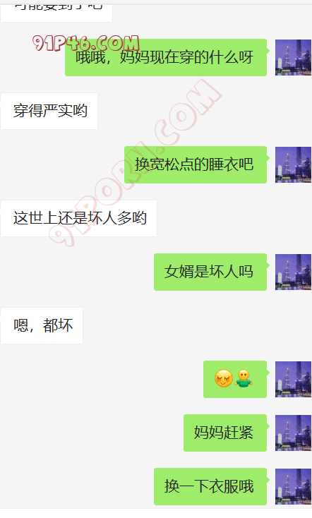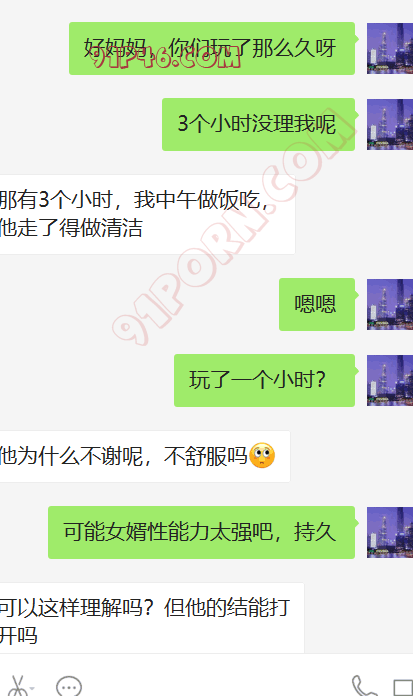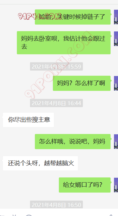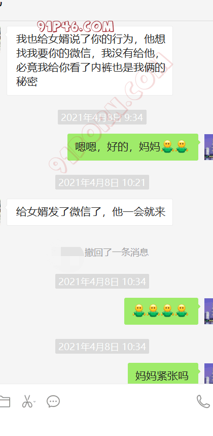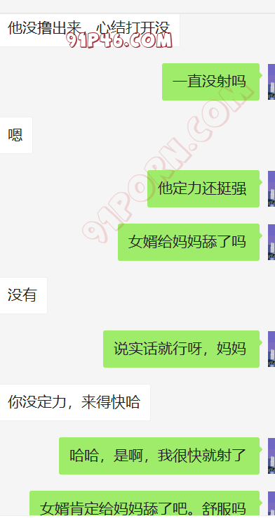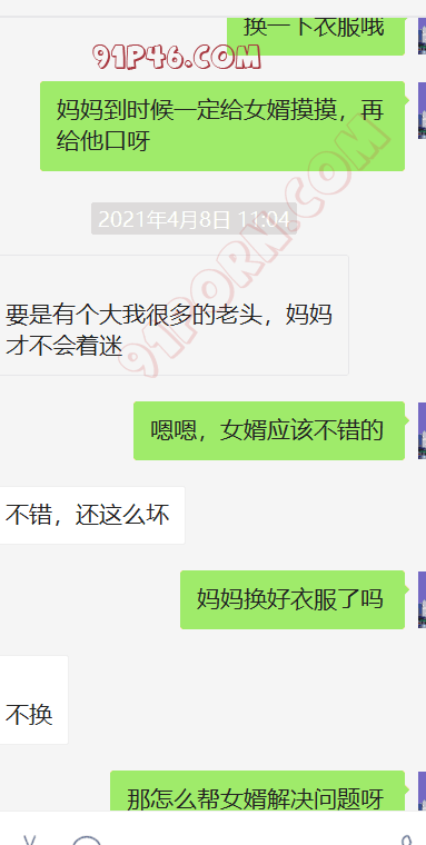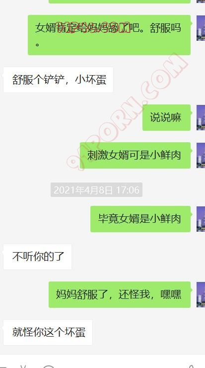 这个小伙的岳母是丧偶独居,跟女婿在一个城市,我加上她以后,慢慢聊天,开始跟她吐露自己恋母的心声,叫她妈妈,也跟她说喜欢自己的岳母,刚开始跟她说女婿对岳母都有感觉,她还不相信。我就让小伙故意动了她洗手间的内裤,后来她才开始觉得我说的对了,后来小伙主动向她承认自己动她内裤的事情(当然也是我怂恿的,岳母有了我的铺垫,当然也不生气),小伙就说自己经常失眠,因为会想岳母。后来我就怂恿岳母帮他一次,也许就解决了他的失眠了,怂恿了很久,为了女婿的健康,她答应了帮女婿,就主动给女婿发信息,让他去她家,就有了聊天记录的一幕。