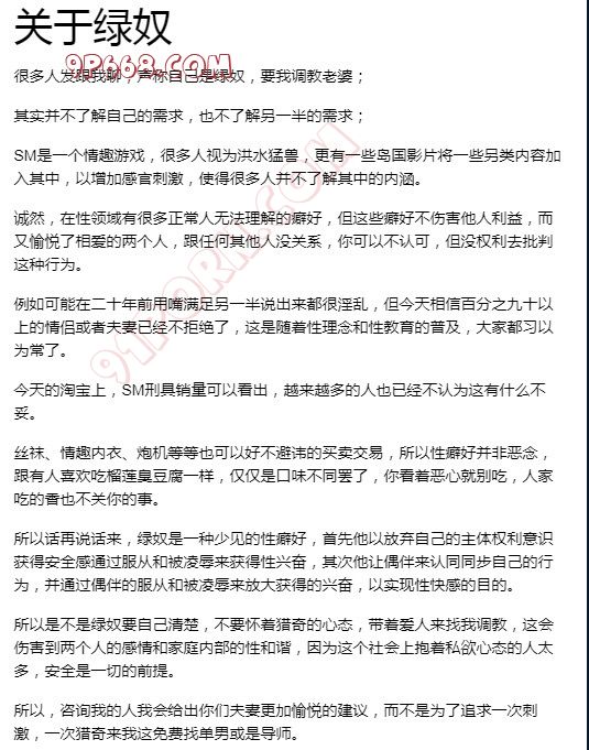 绿帽~绿帽绿奴形成的心理需求各不相同,有心理造成,也有生理造成,但殊途同归都有一样类似的心理。