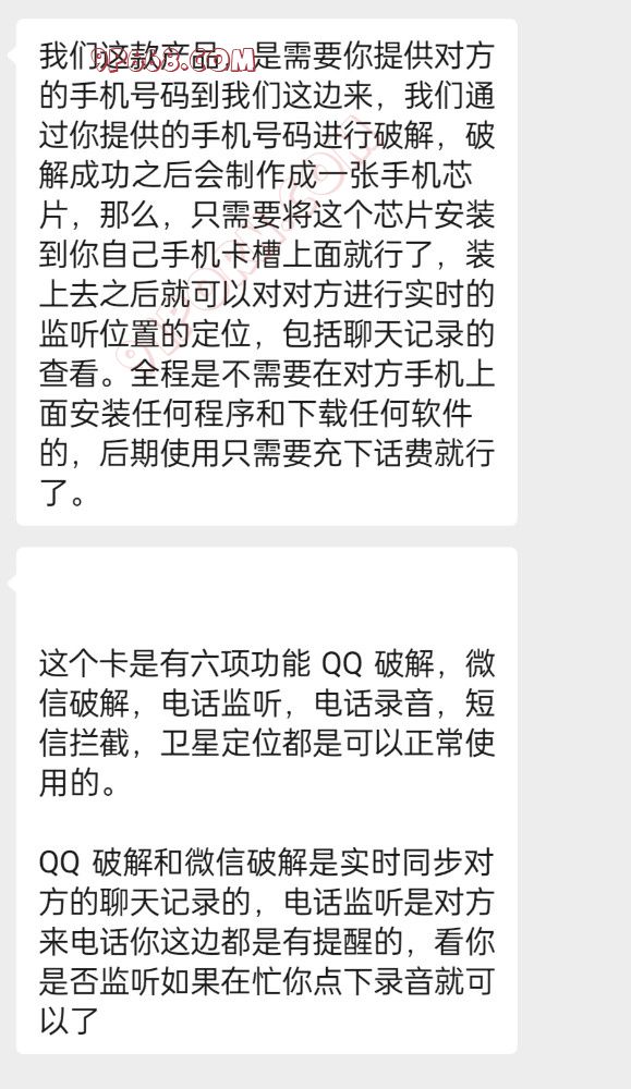 可以同步对方手机操作,短信同步,电话录音,同步微信,调用对方摄像头,录像录音现场环境,远程拍照,年费1800,安卓手机能用,需要安装软件,需要你自己能拿到对方手机半小时左右,