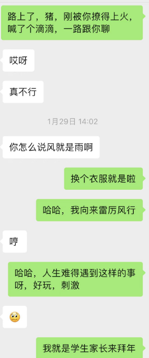 咱是雷厉风行的人,马上打车过去,到了楼下给她拍小区的照片,她都惊呆了,没想到我真的来了;扭捏,犹豫了半天,在我的游说下最后还是开车出来接我了,我说我就是个学生家长,过年给你拜年,然后去买了水果啥的