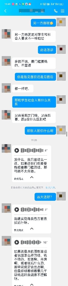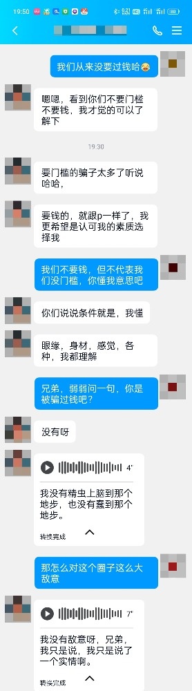 第一次认识,见面之前dn最多付50以内的门槛,不行,直接pass;其他如房间费一定要dn自己订和付(但可以订离对方近一点的酒店),这样对方也方便,并且遇到口嗨的,也可自己住一晚,这总比让骗子拿着钱逍遥要好,这不是金额大小的问题,给骗子一块钱我都嫌多,当然dn自己自己也要有素质,一是别抠,稍微订的好一点,二是先见个面,合适的话,一起办入住,不要自己在房间里等,这也是让对方放心。以上做不到的dn就是狗。真的,最近碰到个直播验证的dannv,没想到竟然也是个骗子,这应该是个团伙骗子,真的,现在的骗子不光有抠脚大汉,应该还有真的男女搭档的,太坏了(此人有三个ID(目前均已被封),ying87116、susuzuimei、晓婷姐姐,别问我怎么知道的,zfb昵称是❌❌,姓名最后一个字是宇,性别是女)
