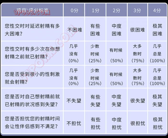 如果看到这里,你依然无法判断自己是否早泄,也可以参考PE评估量表,对各项进行打分后,再对比结果进行判断: