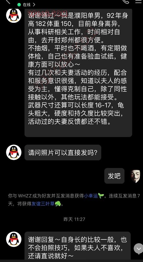 楼主展示的素质单男聊天方式确实很有科研人员的素养,上来先把自己的情况用一段话整体详细进行介绍,随后在发照片之前先确认好夫妻是否方便看照片。在交流过程中,时间地点、自己的形成安排等信息传达的非常准确。