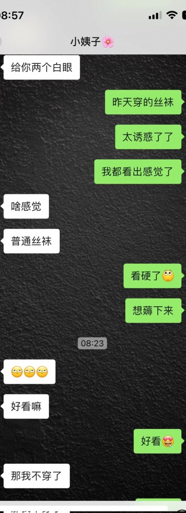 昨天小姨子聊天,聊出感觉了,想过去摸一下的,老婆醒了。只能憋着了,我说昨天穿的丝袜好看,今天还穿不。她说叫她姐穿 刚问小姨子睡了没,问问那功夫摸她有没有感觉,下面湿了没,她说有感觉,我说我想去摸你,她把门锁了。。我说我想看她穿啥内裤。给我拍了几张照片,太好看了。好想过去舔