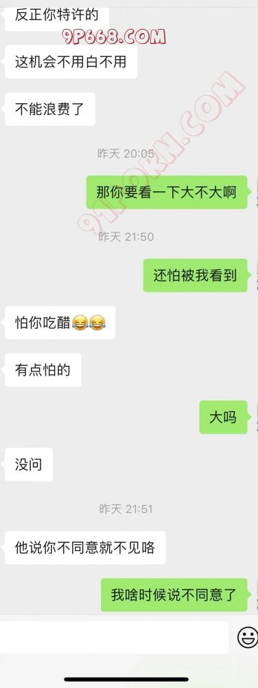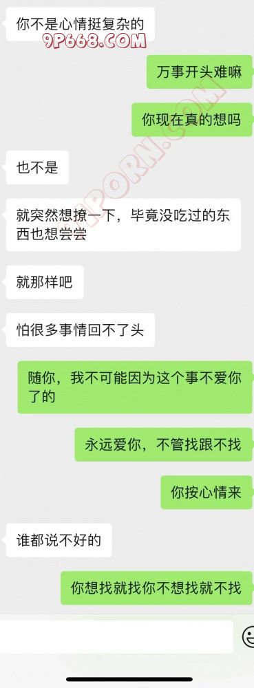 况是这样,走一年前开始发现喜欢看绿帽淫妻的片子,做爱的时候开始跟老婆说,慢慢带入,刚开始她非常反感,后来慢慢做的时候也同意,但是做完就不行甚至翻脸。前段时间说担心影响家庭影响感情,然后这段时间我没说这个事情,但是她昨天晚上自己上交友网站找了一个聊天。然后告诉了别人情况,这个男的让她试探我,结果她真的按人家男的说的方法来试探我,这我有点不爽。然后现在的心情确实是很复杂,有期待有激动有担忧有害怕。她目前的状态我感觉是想要试试但是害怕,一是性病艾滋病这些,二是夫妻感情跟家庭,三是过不去传统道德。晚上她给我看了全部的聊天记录,再后来说嫌我烦,不想让我看了。然后说等我出差回来给我一次性看,我问她要是这期间你们约了呢,她说约就约呗。反正你同意。我的初衷是所有的都在我的掌控中,但现在我感觉有点脱离我的掌控,我不确定她会不会偷偷背着我去约,会不会被别人操了跟没事人一样,如果是这样我就感觉有点害怕。各位帮我分析一下,她背着我去搞的几率大吗?