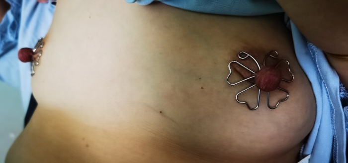 乳房:乳房小,单手可握,乳头长,可佩戴器械,乳头吸盘。