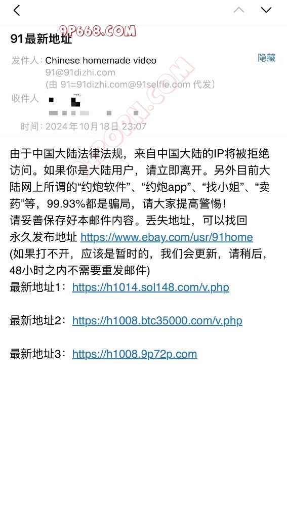 前天发过一个帖子,是关于91视频的,一直以来我用91都是收藏好的网址,每次打开都是书签收藏直接进入,这两天也不知道咋回事,一打开想看的标题视频,视频开始播放时候要不就是视频里提示什么91换新网址了,让我发送[email protected] 给新网址,要么就是打开标题视频跟播放的实际视频驴头不对马嘴,难道一直收藏的网站被黑了?后来我就抱着试试根据视频提示的邮箱发送过去了,没一会给我回复邮件给我新的地址,如图,大家帮我分辨下,这是木马网站还是真实91网站,有懂得留言下,万分感谢。 .