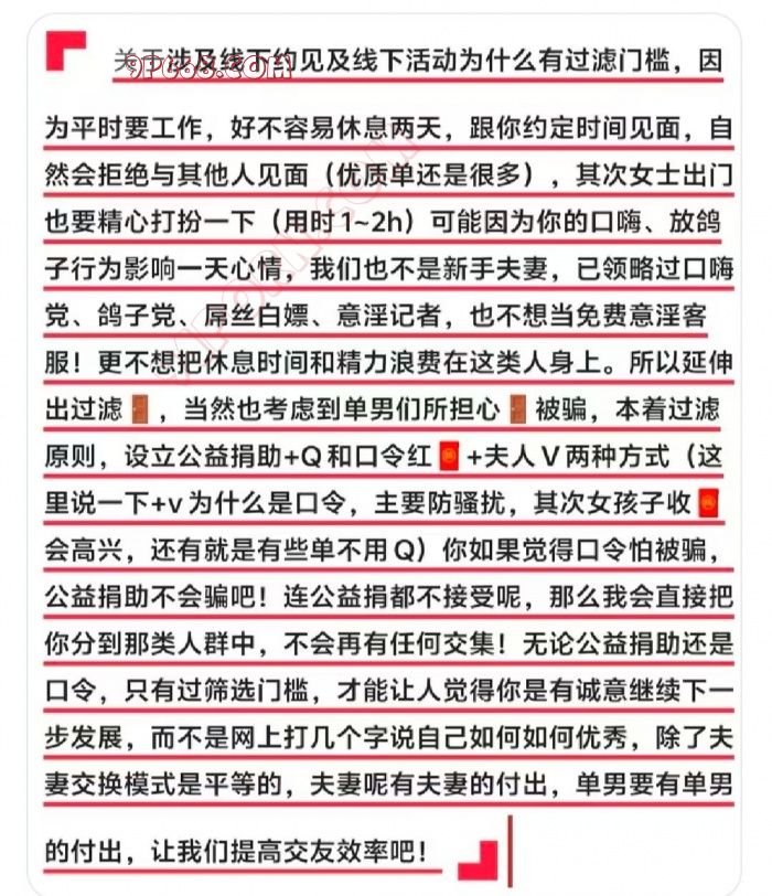 3.筛选:夫妻添加后约定时间不能接视频同时出镜验证拉黑,无经历夫妻和单男设置:198(口令红包或录屏公益任意捐助)方式自选,过滤(口嗨、意淫、照骗、鸽子党)!通过后主动介绍:年龄、身高、体重、武器尺寸、生活照(禁墨镜.口罩)、活动经历+口令门槛!详细介绍便于快速了解+分!请勿发(你好呀、在吗、主动详细介绍)主动过门槛的无论是口令还是公益捐助看到会优先回复。