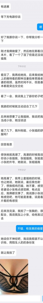 昨晚十点左右,有个绿帽加我,大家可以看聊天截图,加我的时间晚上九点多,因为喝酒了,没聊几句。今天白天简单几句指点,下午发来重要进展,详细看聊天截图。这位绿,是聪明人,一点就透,知道怎么配合。而且执行力比较强,所以进展比较快,相信要不了多久,会满足他淫妻的欲望。