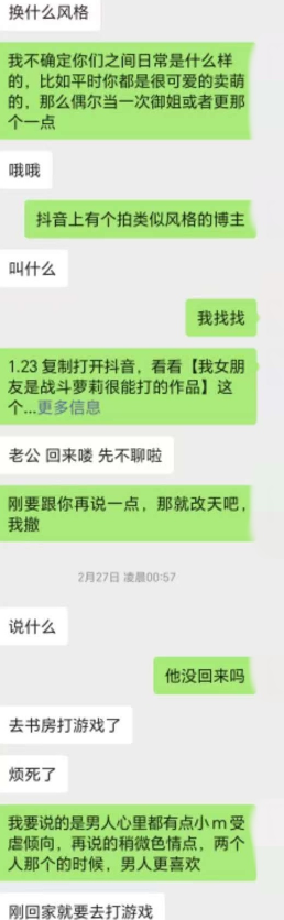 陆陆续续给新手夫妻开发了不少,有成功有失败,最快一周最慢三年,这次是创了新纪录。老公把老婆微信给我,假装加错联系上,当晚聊自慰,第二天聊受不了,把老公微信给我,三人群老婆直接在群里释放自我。聊天太长,先放第一段,过两天发更刺激的第二段。