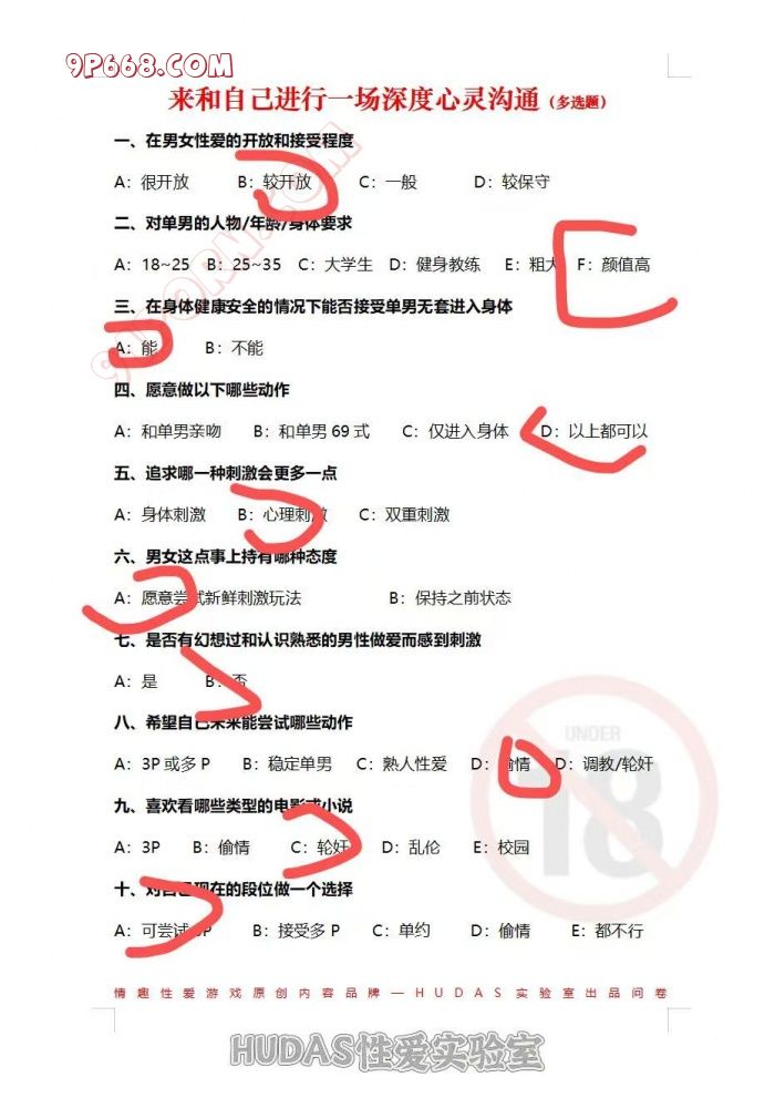 90后夫妻,在房事中谈到3P、偷情、强奸、轮奸等等各种话题已经10年有余了。但是一直没有迈出实际行动!!最近看到一张问卷选择题就让她勾选答案。她说答案是第一眼内心真实想法,兄弟们帮我评论一下我媳妇是属于哪种段位?留下你们的看法和意淫。