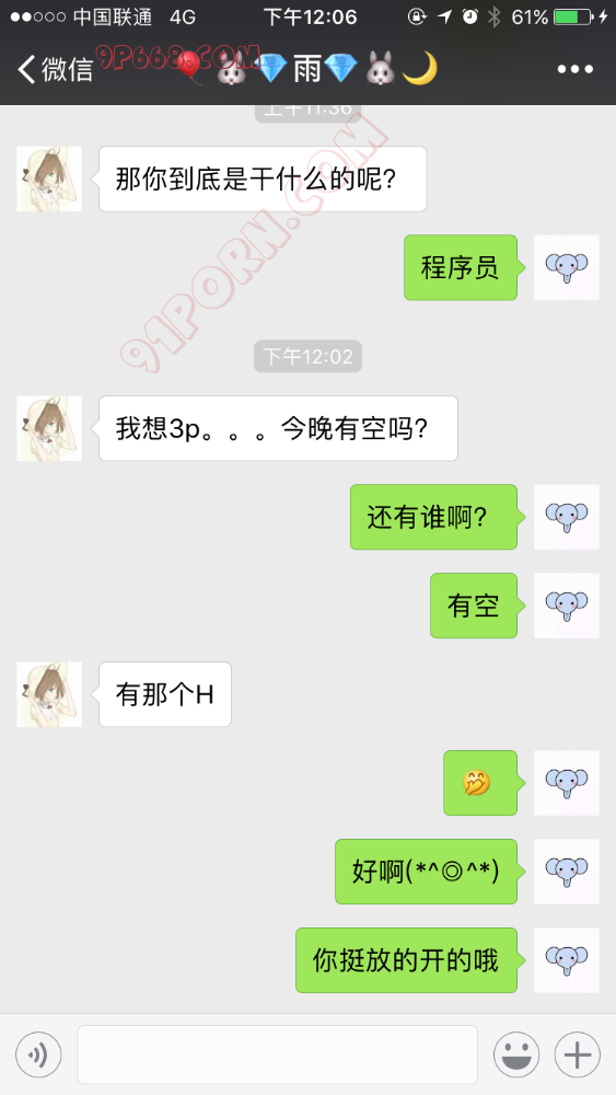 第一次认识是朋友介绍的。我的小母狗想要3P,我就找了个小伙来活动。结果小伙也有个炮友要介绍给我,这个女孩我就加上了,加上以后这个女孩还挺开放,想要一起: