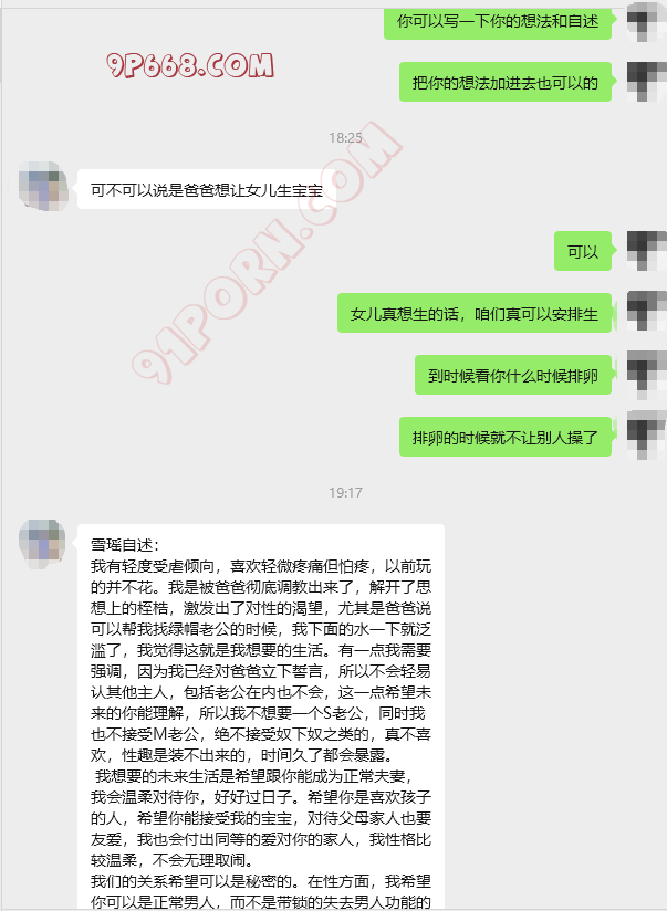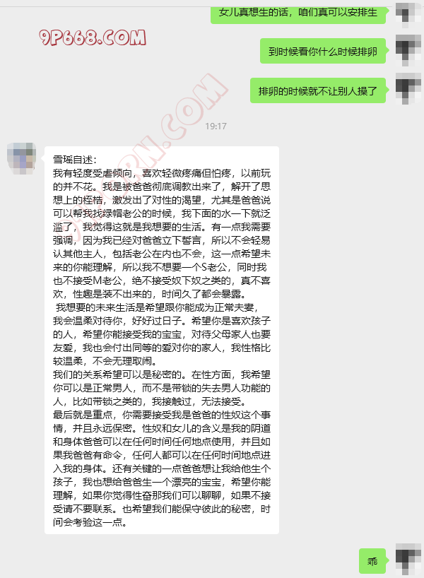 最后就是重点,你需要接受我是爸爸的性奴这个事情,并且永远保密。性奴和女儿的含义是我的阴道和身体爸爸可以在任何时间任何地点使用,并且如果我爸爸有命令,任何人都可以在任何时间地点进入我的身体。还有关键的一点爸爸想让我给他生个孩子,我也想给爸爸生一个漂亮的宝宝,希望你能理解,如果你觉得性奋那我们可以聊聊,如果不接受请不要联系。也希望我们能保守彼此的秘密,时间会考验这一点。