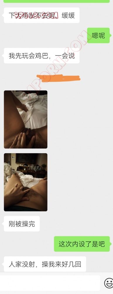 第二天上午我睡到了十点,看手机没有消息也是自己郁郁寡欢。中午12点,给夫人打过去电话,电话里说是在赖床还没起,可我听出来是被干了一上午。快一点的时候,夫人发来微信,是刚被艹完的小逼。说是x去卫生间了,一会下午两个人先去吃点东西。