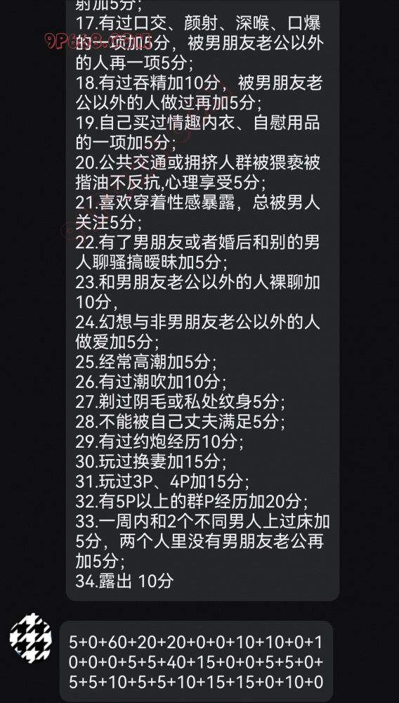 17.有过口交、颜射、深喉、口爆的一项加5分,被男朋友老公以外的人再一项5分;
