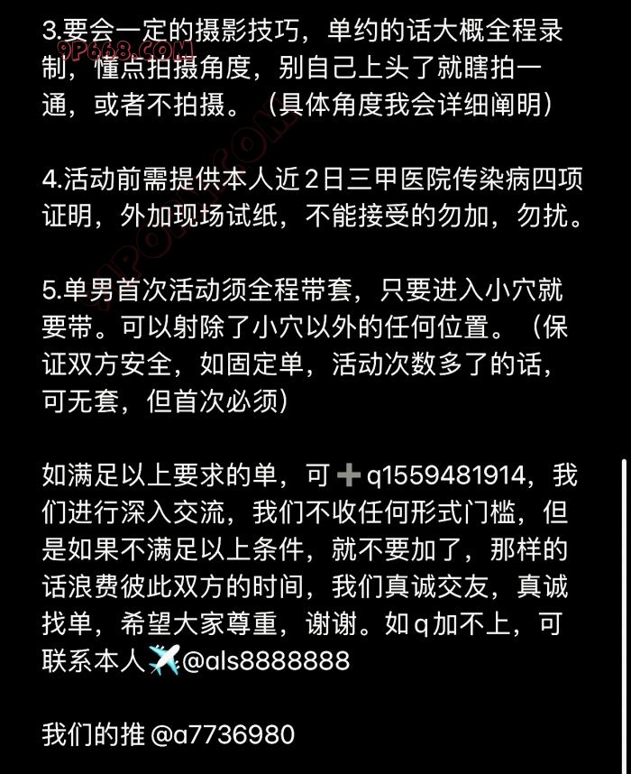 请看好我发的要求图!!!看好再加!!!谢谢!!! 我们活动经验很少,一共有过3个单男,5次单约,3次3p,以前从未被放鸽子,口嗨过!最近发了上条贴,加了很多单男,被口嗨一次放鸽子一次,希望大家看好在家,我们真诚交友,避免浪费双方时间。