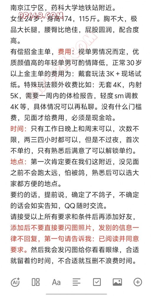 很久没发帖了,详细情况和验证可以搜索本人之前的帖子查阅。由于近期已经确定了一位优质金主单长期相处,很不错,所以特意发帖想再寻找一位优质金主单,为以后一起玩4P的三男一女做准备。 详细情况见下图要求,联系方式见签名,谢谢,非诚勿扰!非优质勿扰!听不懂人话的,自以为是的,说话说不明白的,勿扰!!!